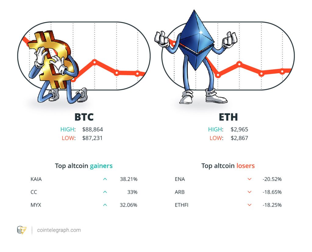 The top three altcoin losers of the week are Ethena (ENA) at 20.52%, Arbitrum (ARB) at 18.65%, and ether.fi (ETHFI) at 18.25%. For more info on crypto prices, make sure to read Cointelegraph’s market analysis.