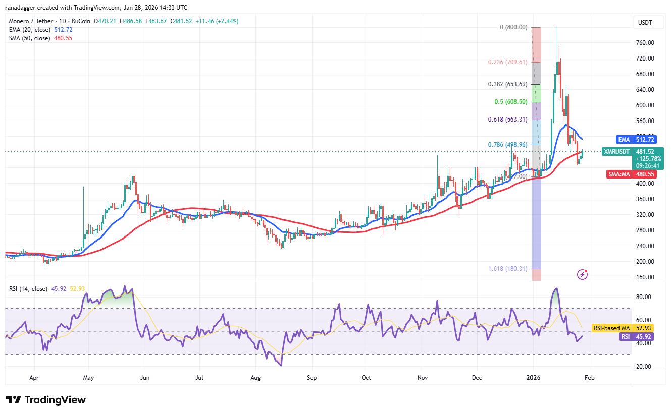 The downsloping 20-day EMA ($512) and the RSI near the 46-level signal that the path of least resistance is to the downside. If the price slips below $445, the XMR/USDT pair may complete a 100% retracement of the latest leg of the rally and plunge to the $417 level.