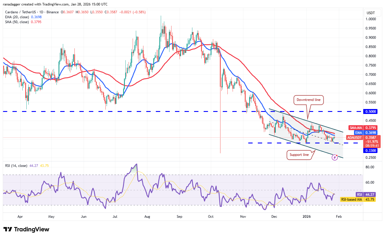If the price turns down sharply from the moving averages, the likelihood of a break below the $0.33 level increases. The ADA/USDT pair may then plummet to the support line of the descending channel pattern.
