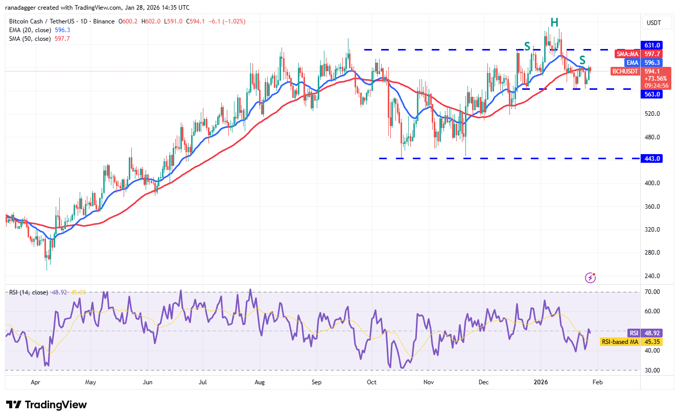 The moving averages are flattening out, and the RSI is near the midpoint, signaling a balance between supply and demand. If the price breaks above the moving averages, the advantage will tilt in favor of the bulls. The BCH/USDT pair may then ascend to $631 and later to $670.