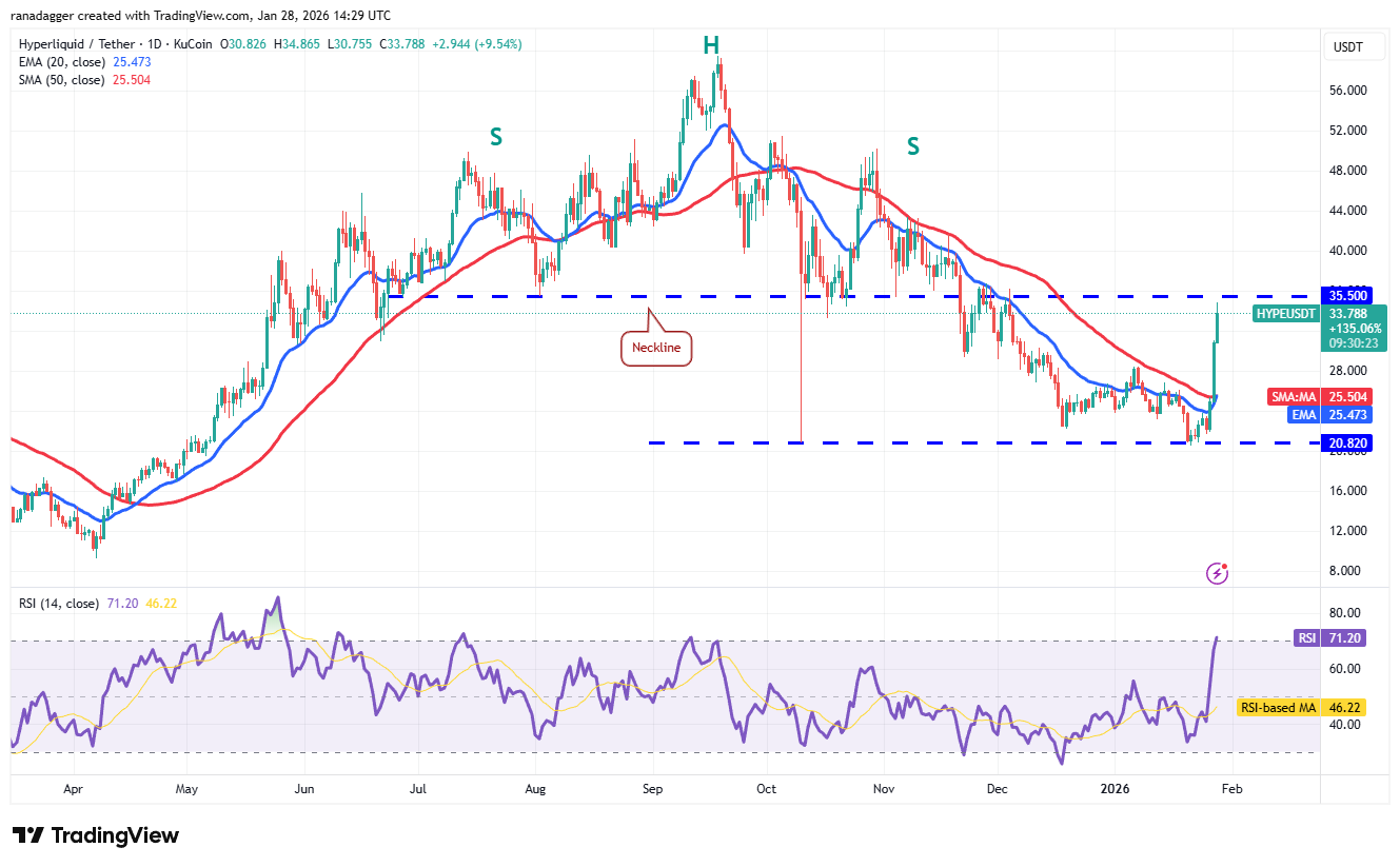 Hyperliquid (HYPE) turned up from the $20.82 support on Jan. 21 and soared above the 50-day SMA ($25.50) on Tuesday, indicating solid buying at lower levels.
