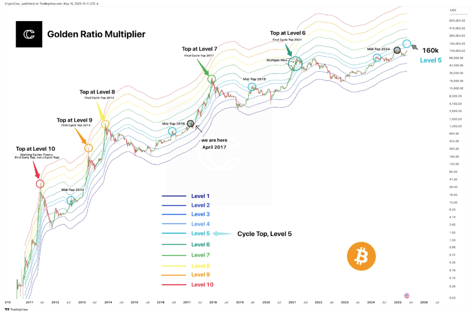 The chart accompanying CryptoCon’s post paints a familiar picture with the Golden Multiplier Ratio. Each band, ranging from Level 1 to Level 10, is based on a multiplier level derived from the 350-day moving average.  Bitcoin has topped at various levels: Level 10 in 2011, Level 9 and 8 in 2013, Level 7 in 2017, and Level 6 in 2021. The current cycle’s peak should most likely be Level 5, but the Bitcoin price is yet to get there.