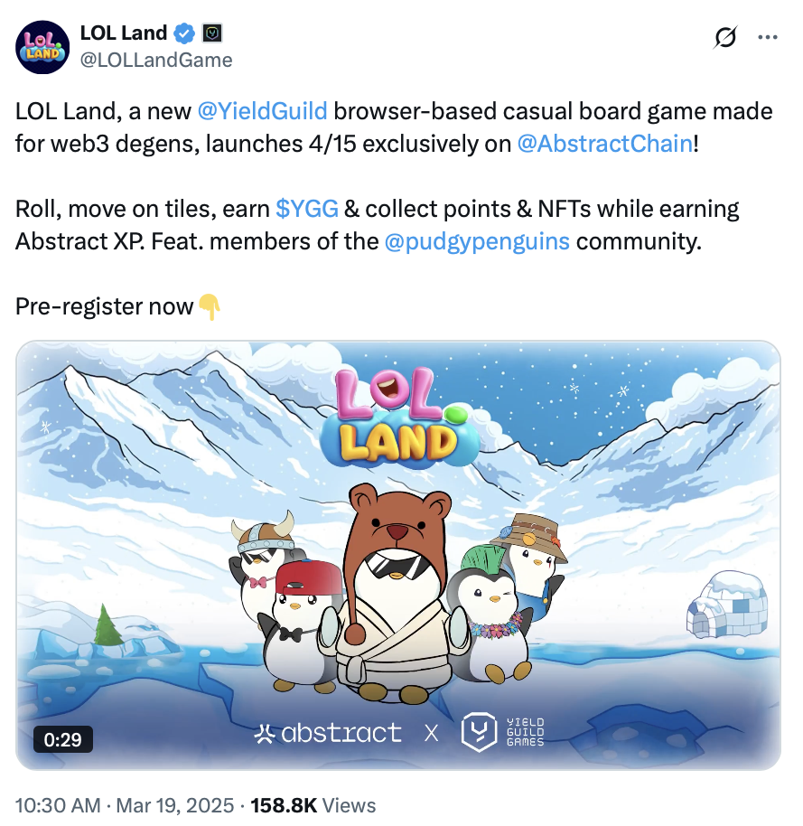 “Roll, move on tiles, earn YGG and collect points and NFTs while earning Abstract XP,” is how LOL Land describes itself in a March 29 X post.