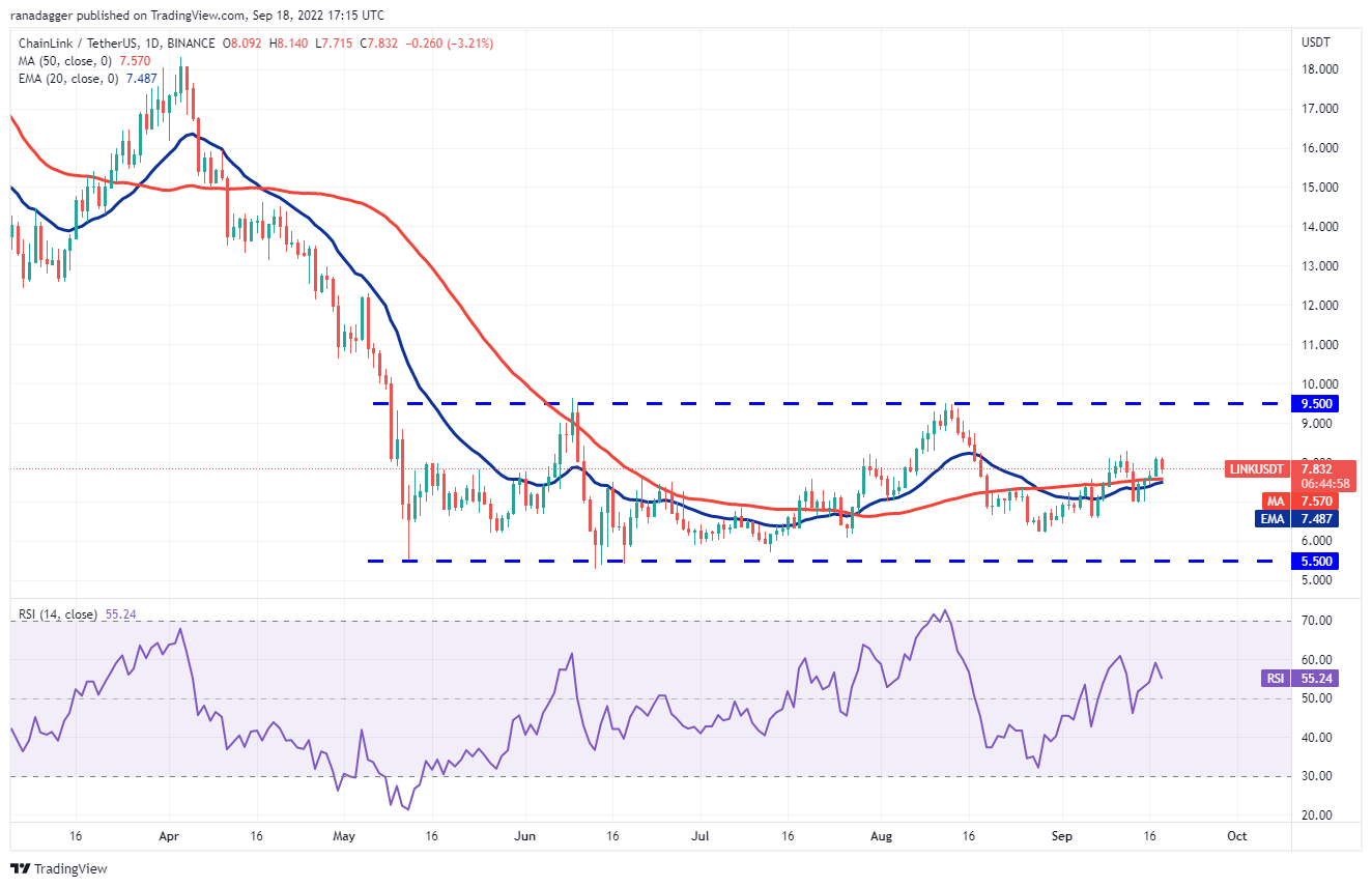 Chainlink (LINK) has been stuck inside a large range between $5.50 and $9.50 for the past several weeks, indicating that buyers are attempting to form a bottom. The bulls pushed the price above the moving averages and the RSI jumped into positive territory, indicating that the positive momentum could be improving.