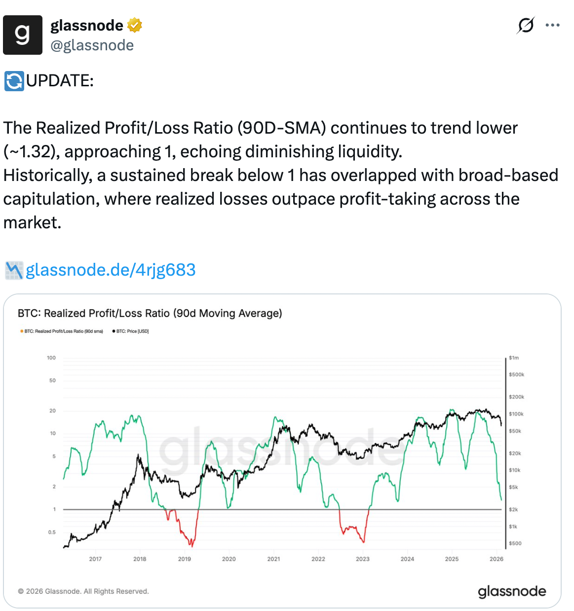 Bitcoin’s Realized Profit/Loss Ratio is about to break below 1, levels that have historically aligned with “broad-based capitulation, where realized losses outpace profit-taking across the market,” Glassnode said.
