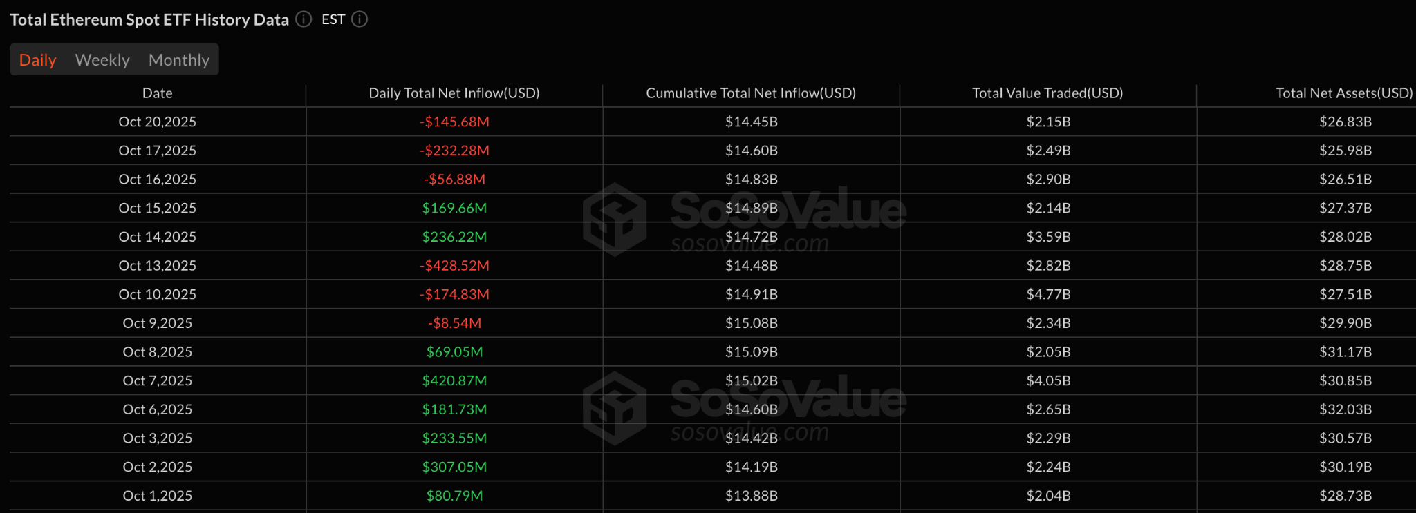 Monday alone saw Ether ETFs shed $145.7 million, bringing total net outflows over the past eight days to $640.5 million.