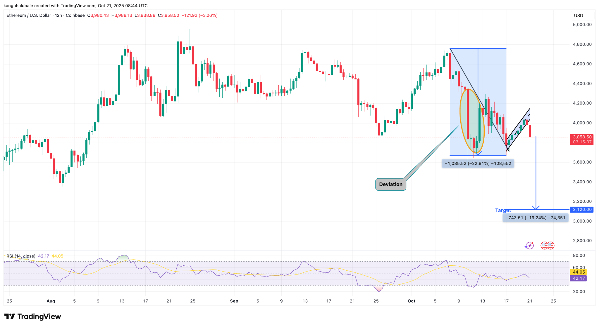 Ether (ETH) fell to $3,800 on Tuesday, after failing to hold $4,000, as spot Ethereum ETF investors continued their net redemptions. This came as the technical setup pointed to a deeper correction for ETH price.