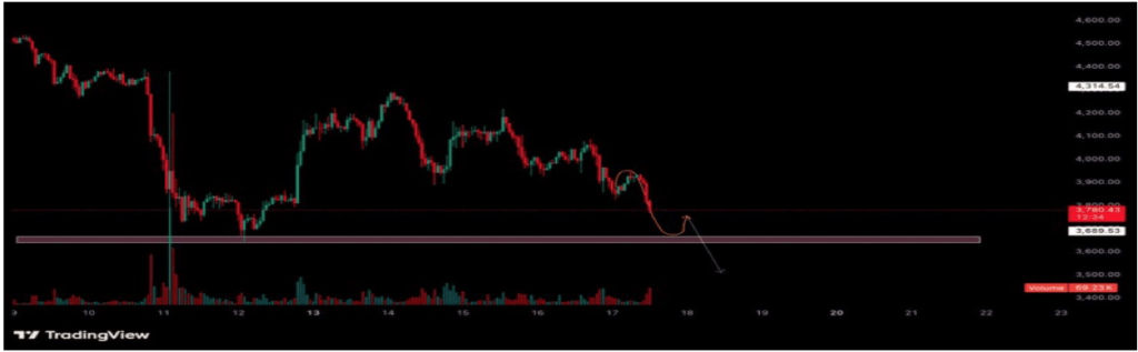 Other analysts like Marzell have echoed similar concerns, stating that Ethereum is now nearing a “crash zone.” However, he also highlighted the $3,690 – $3,750 range as a possible short-term demand area where buyers could step in again and trigger the next leg up.