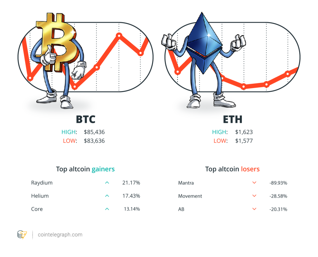 The top three altcoin losers of the week are Mantra (OM) at 89.93%, Movement (MOVE) at 28.58% and AB (AB) at 20.31%. For more info on crypto prices, make sure to read Cointelegraph’s market analysis.