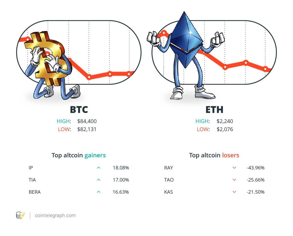 At the end of the week, Bitcoin (BTC) is at $84,400 Ether (ETH) at $2,240 and XRP at $2.15. The total market cap is at $2.81 trillion, according to CoinMarketCap.
