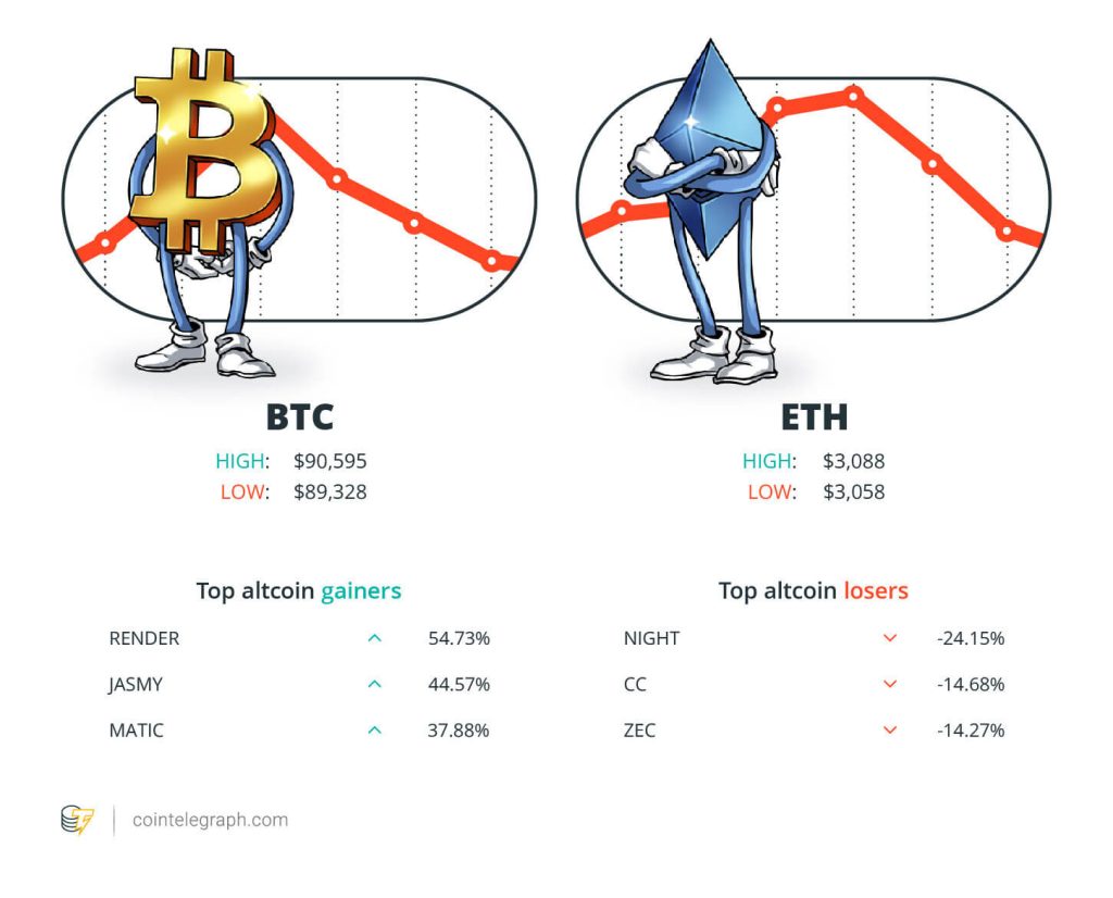 At the end of the week, Bitcoin (BTC) is at $90,595, Ether (ETH) at $3,088 and XRP at $2.09. The total market cap is at $3.09 trillion, according to CoinMarketCap.
