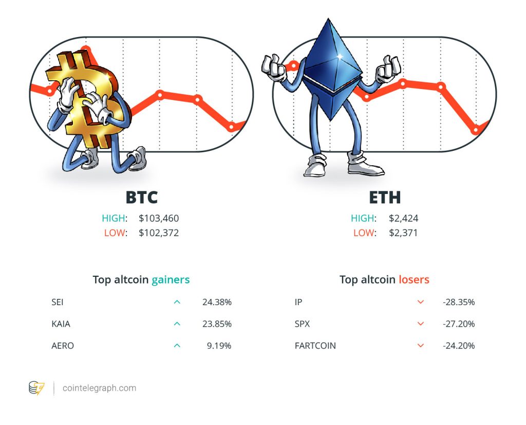 At the end of the week, Bitcoin (BTC) is at $103,460, Ether (ETH) at $2,424 and XRP at $2.12. The total market cap is at $3.20 trillion, according to CoinMarketCap.