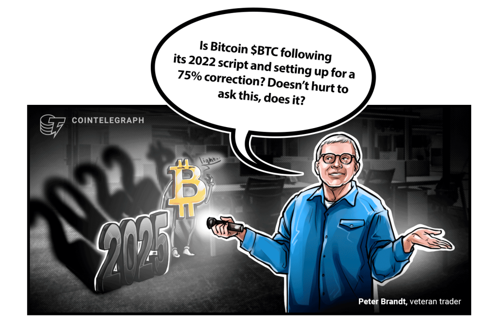 “Is Bitcoin $BTC following its 2022 script and setting up for a 75% correction? Doesn’t hurt to ask this, does it?” Brandt said in an X post on Tuesday.