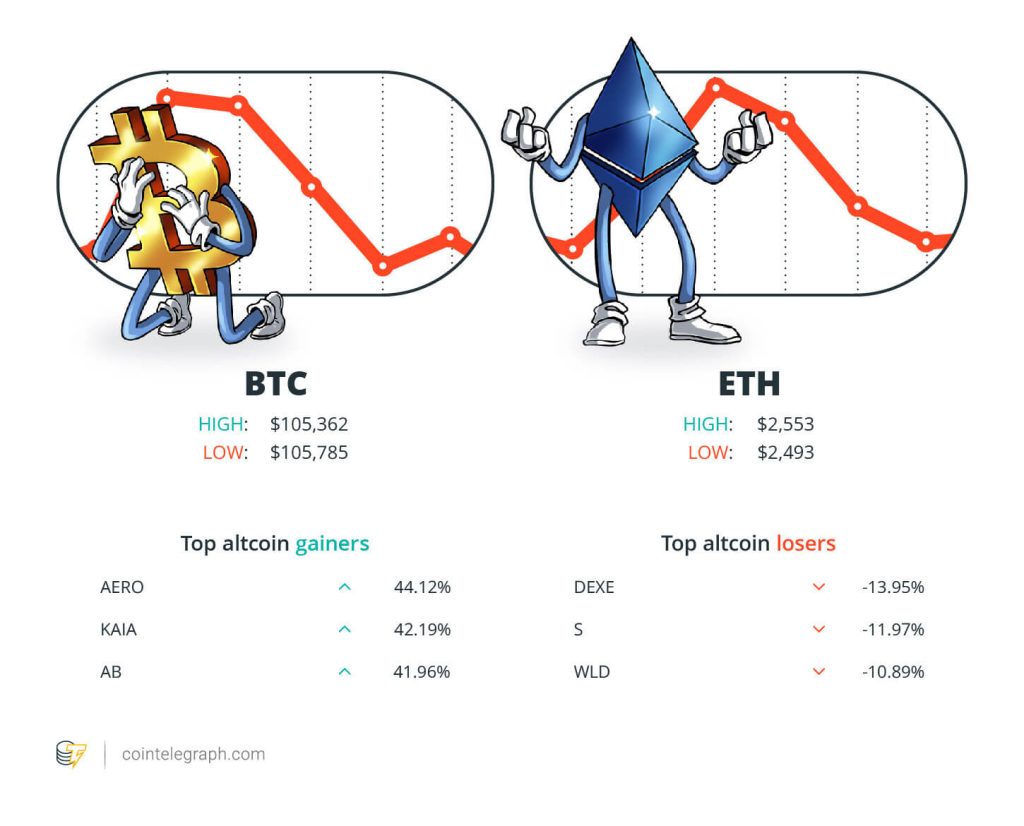 At the end of the week, Bitcoin (BTC) is at $105,362, Ether (ETH) at $2,553 and XRP at $2.15. The total market cap is at $3.29 trillion, according to CoinMarketCap.