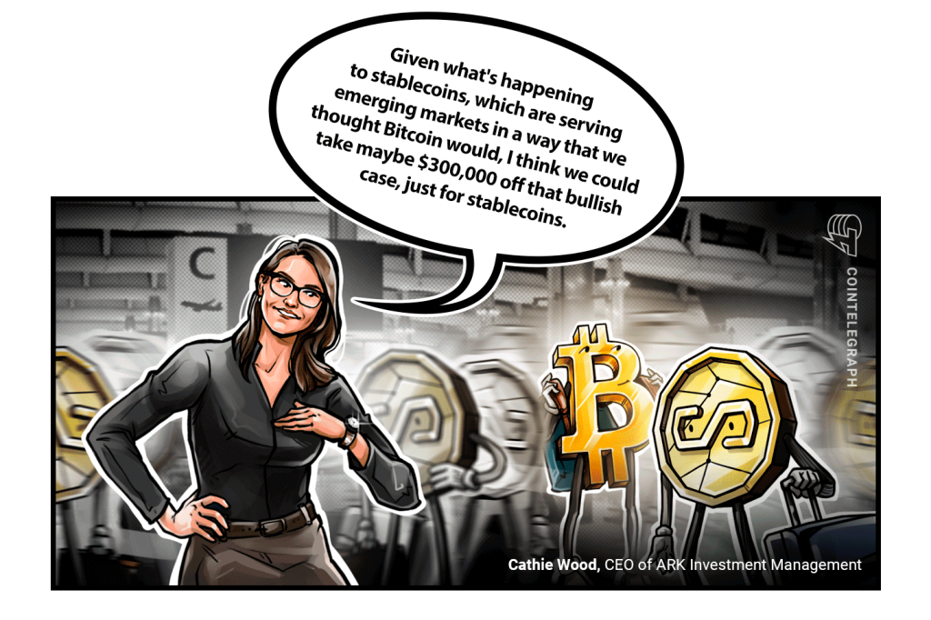 Cathie Wood drops BTC forecast by $300K, says stablecoins eroding market share