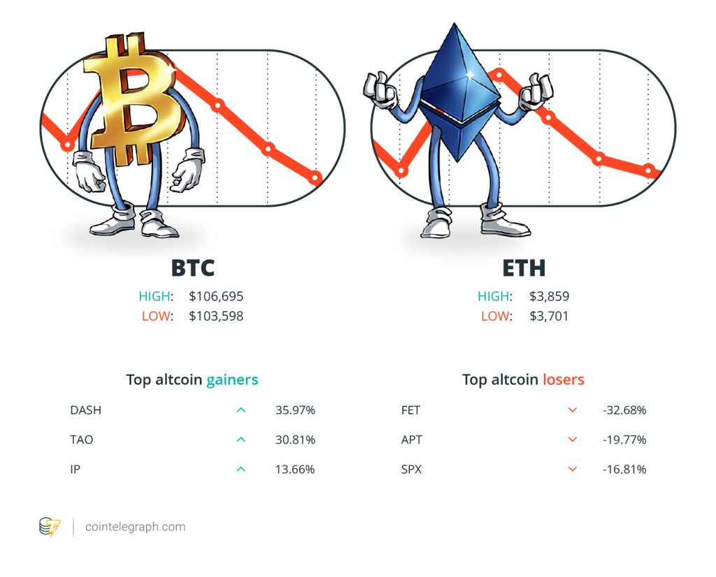 At the end of the week, Bitcoin (BTC) is at $106,695 Ether (ETH) at $3,859 and XRP at $2.32. The total market cap is at $3.61 trillion, according to CoinMarketCap.