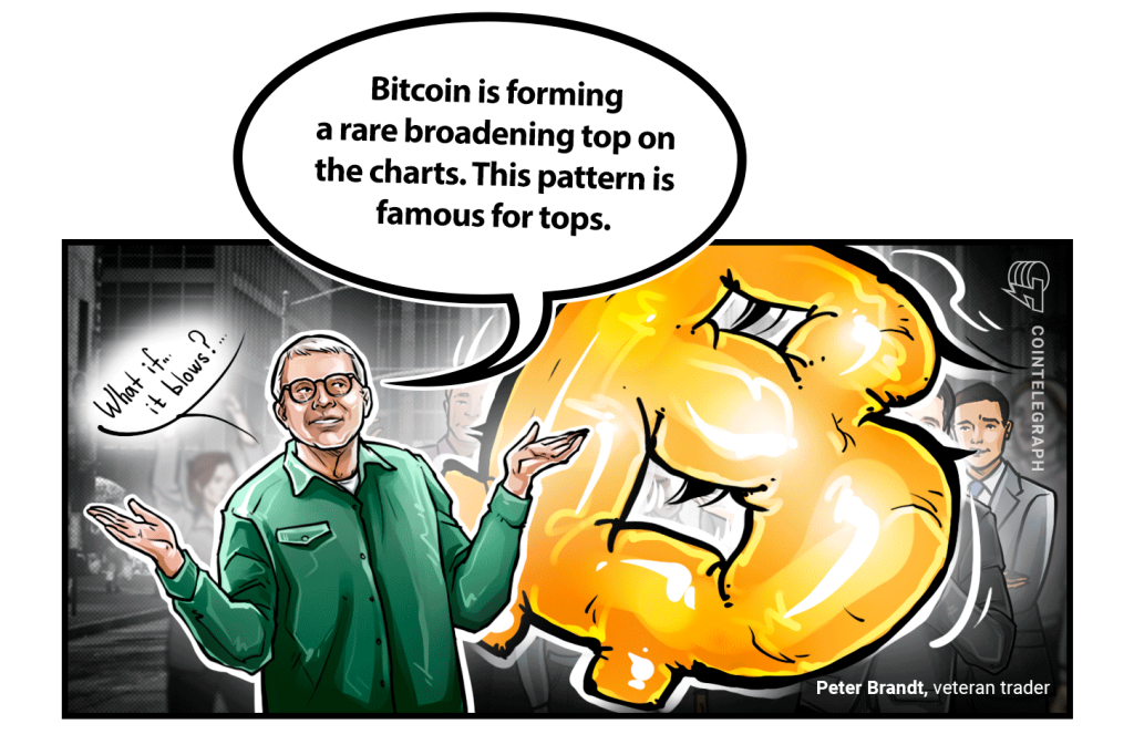 “Bitcoin is forming a rare broadening top on the charts. This pattern is famous for tops,” Brandt told Cointelegraph. “In the 1970s, Soybeans formed such a top, then declined 50% in value.”