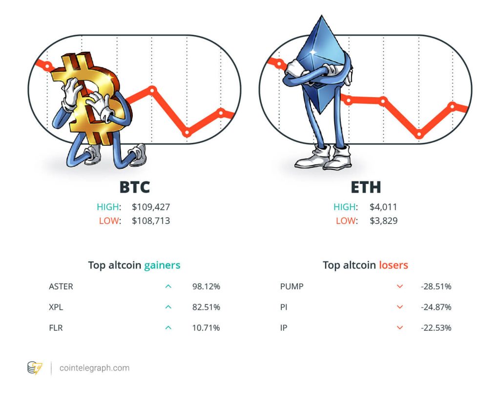 At the end of the week, Bitcoin (BTC) is at $109,427, Ether (ETH) at $4,011 and XRP at $2.78. The total market cap is at $3.78 trillion, according to CoinMarketCap.