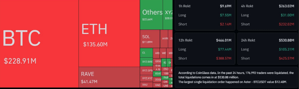 Around 80% of the $530 million in total liquidations over 24 hours — roughly $425 million — came from leveraged short positions in the two largest cryptocurrencies.