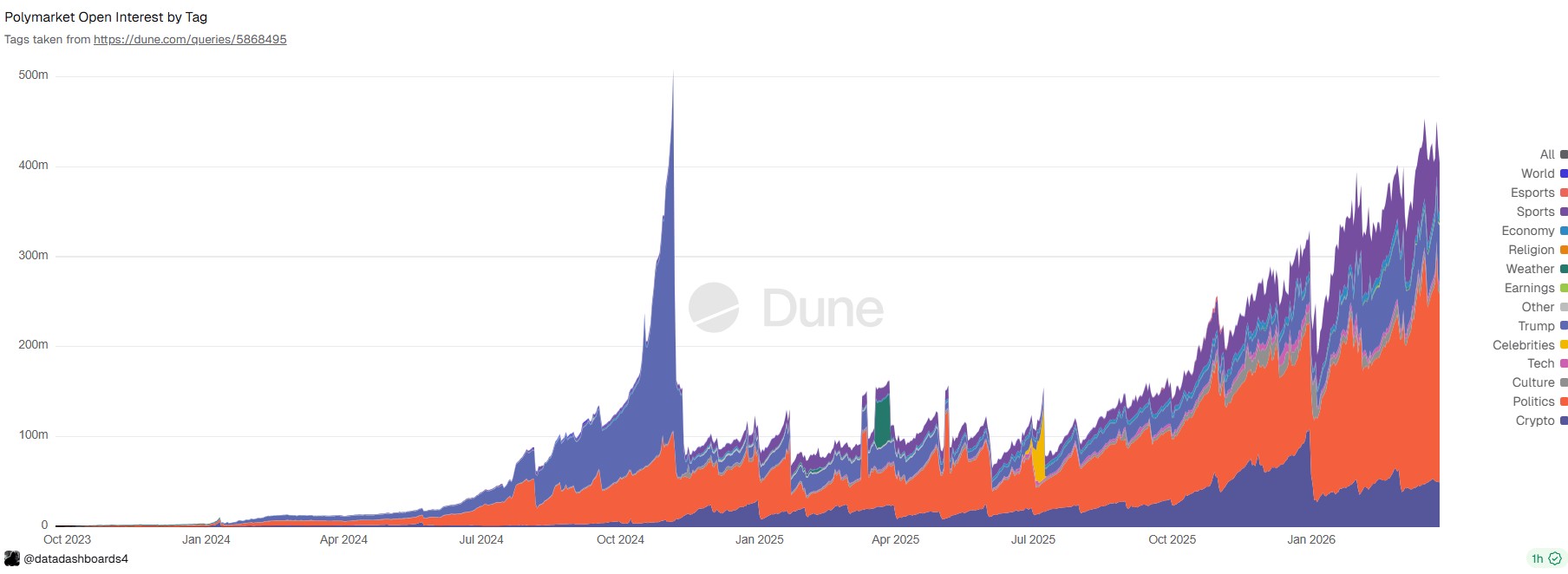 Polymarket’s open interest was highest around October and early November of 2024, during the US elections, according to Dune Analytics data. Following a sharp initial decline, it has continued to surge in popularity, with politics leading as the most popular topic, followed by sports and crypto.