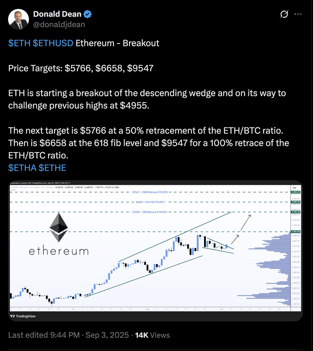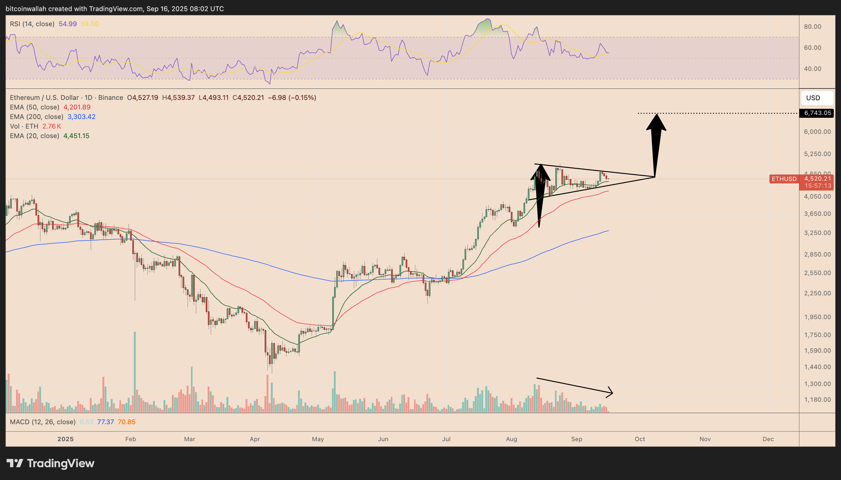 The chart pattern projects a move toward $6,750 by October, more than 45% above current levels, if ETH closes decisively above the pennant’s upper trendline.
