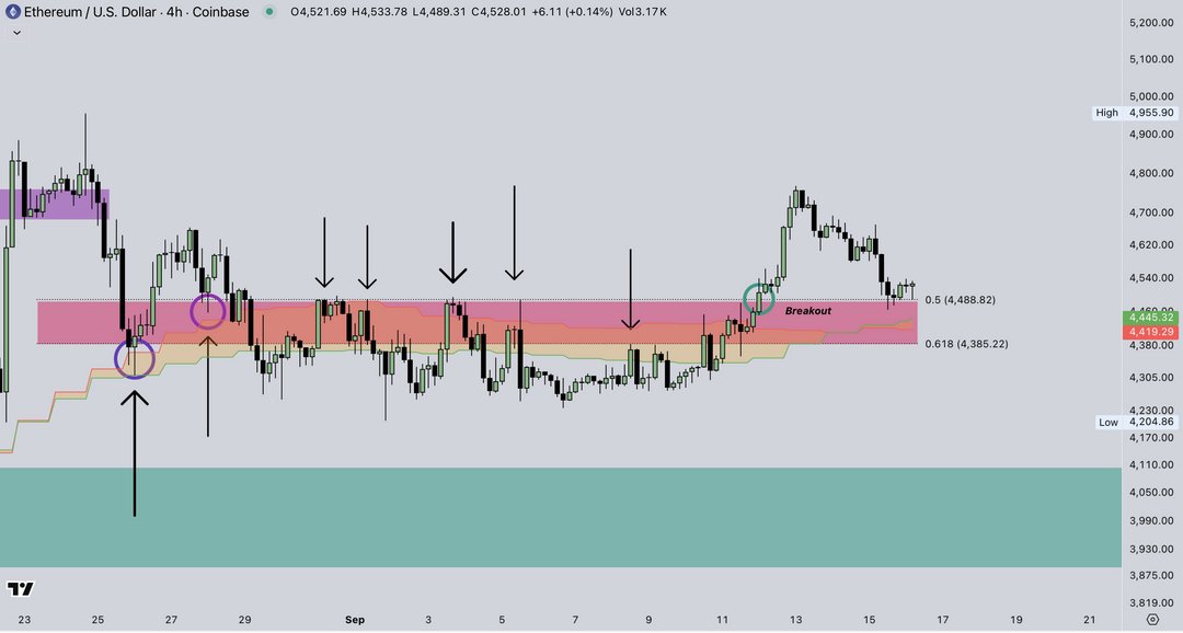Ether bulls are defending the 20-day exponential moving average (20-day EMA; the green wave) near $4,450, showing resilience as markets price in a 96.1% chance of a Fed rate cut this week, up from 85.4% a month ago, with two more reductions expected by year’s end.