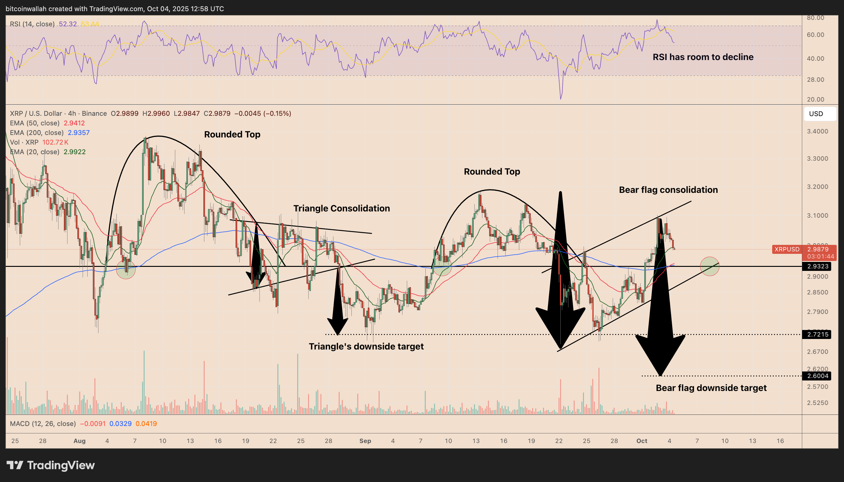 In September, the token’s price formed a rounded top, then slipped into a period of symmetrical triangle consolidation before breaking down sharply. That move sent XRP prices tumbling toward the $2.70 area.