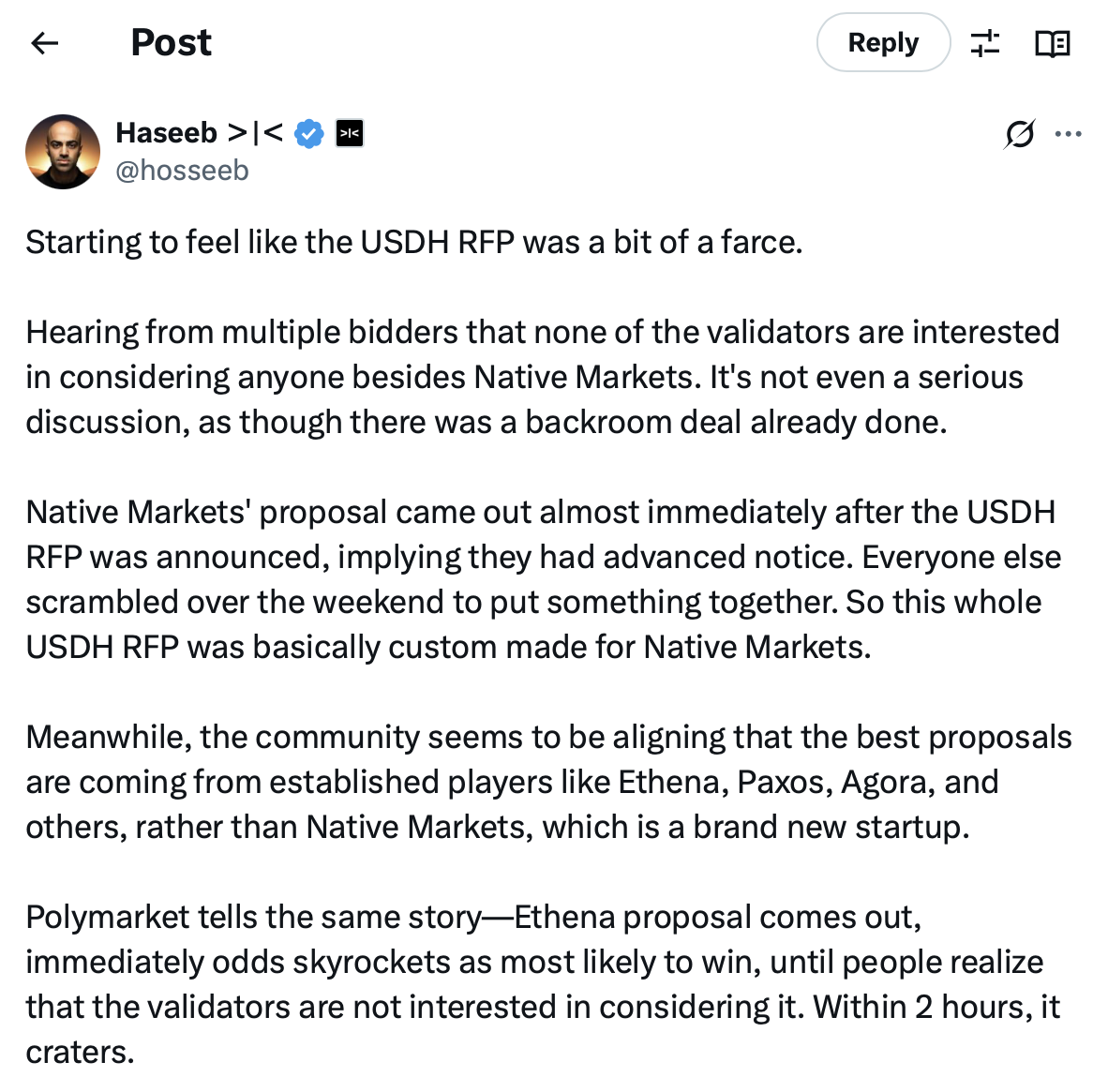 The process was not without controversy. Some critics, such as the managing partner at venture capital company Dragonfly Haseeb Qureshi, argued that it appeared to be tailored to favor Native Markets, even though larger companies such as Paxos, Ethena and Agora had put forward more robust proposals.