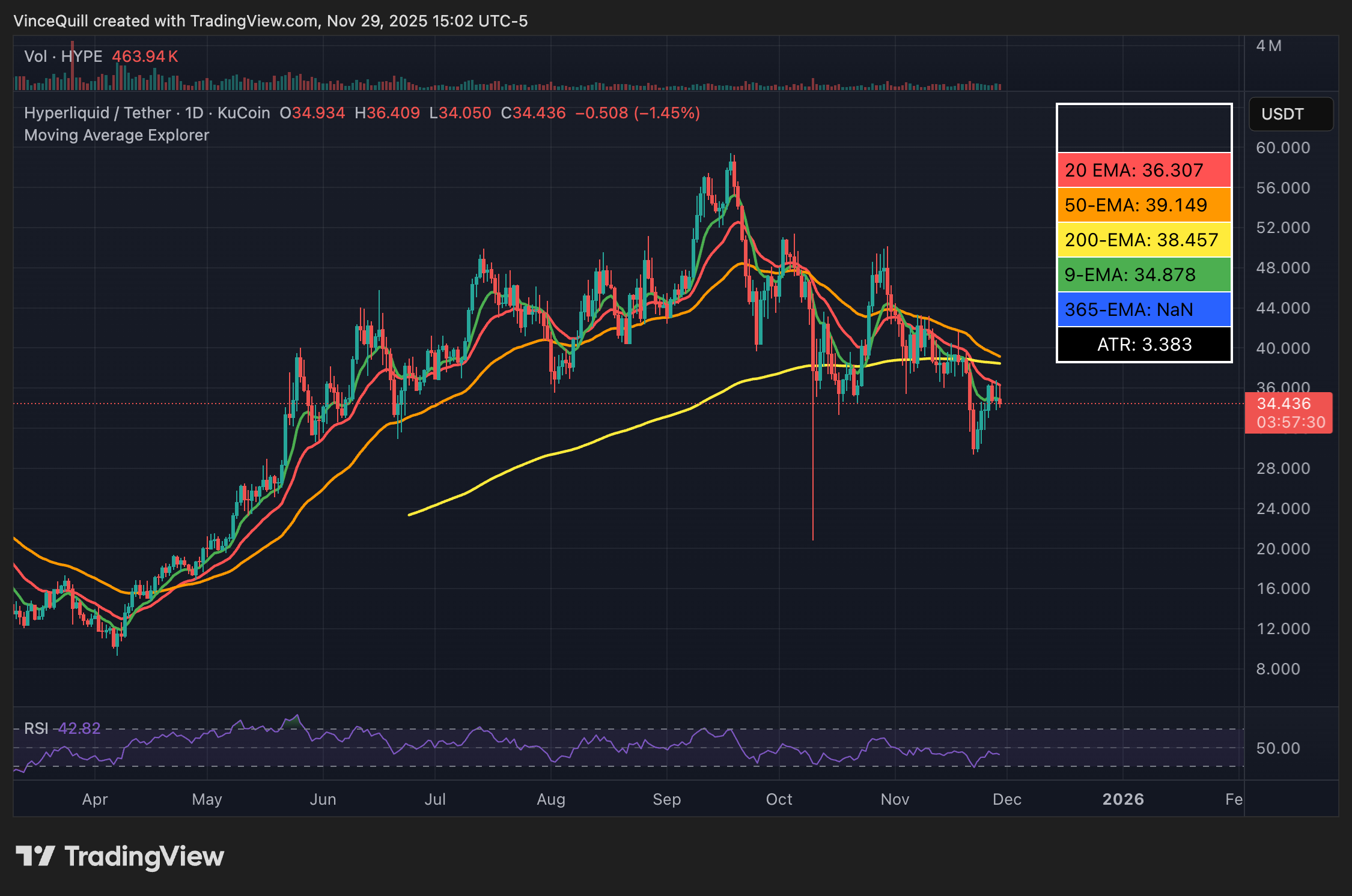 HYPE’s price action shows a steady uptrend, culminating in an all-time high in September, followed by a decline. Source: TradingView