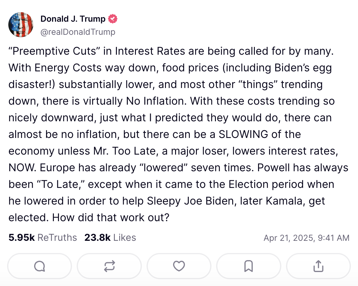 That dance takes us to now. Last week, Trump repeatedly intimated that he would like to fire Powell, and the market didn’t like it. On Monday, Trump provoked a crash by calling Powell a “major loser” on Truth Social. In response, Treasury Secretary Scott Bessent has reportedly voiced concerns with the risks of firing Powell to Trump, who seems, for now, to have acquiesced, stating Tuesday that he would not fire his Fed chair.
