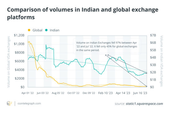 Since the crypto tax regime in India came into effect in July 2022, Indian exchanges have experienced trading volume declines of up to 70%. WazirX, for instance, saw a 63% drop in volume in a single day following the TDS announcement.