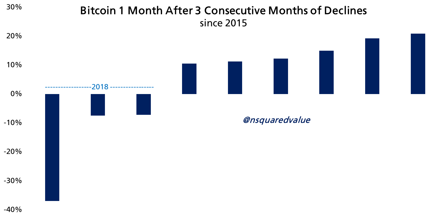 “What happens next? 1 month later, Bitcoin was positive 67% of the time.  However, the 3 negative instances were all in 2018 and marked the end of that bear market.”