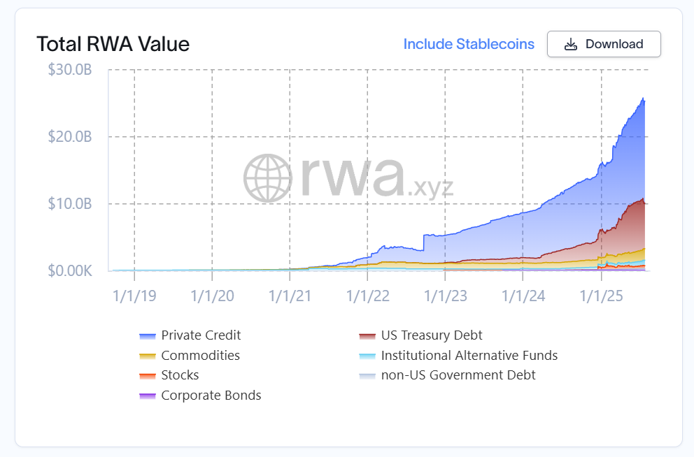 Excluding stablecoins, the total value of onchain RWAs has increased steadily over the past 30 days, reaching $25.2 billion. Source: RWA.xyz