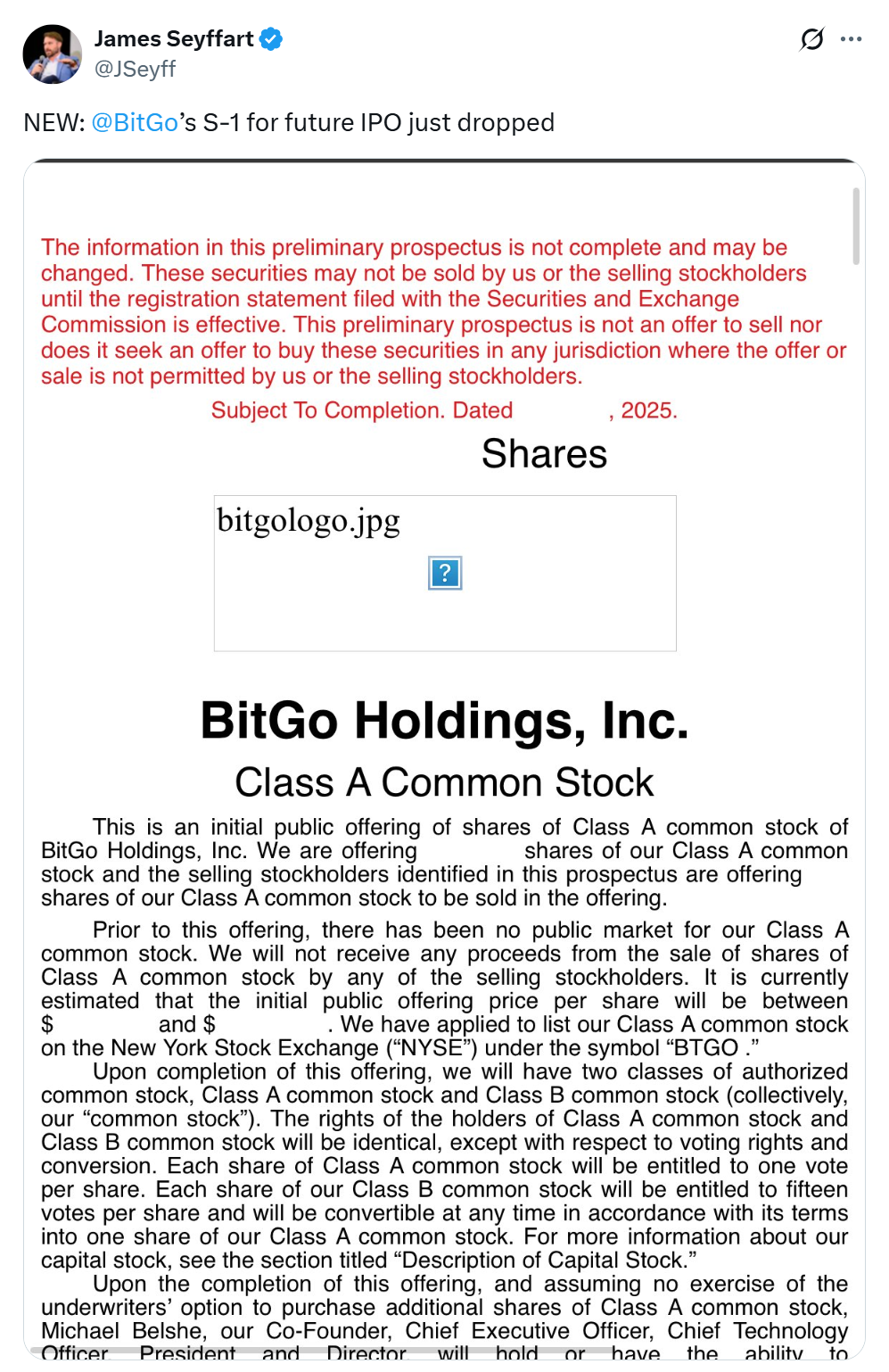 The news came less than a week after crypto custodian BitGo filed to list its common stock on the New York Stock Exchange under a US IPO filed on Sept. 19. The Palo Alto-based company reported about $90.3 billion in assets under custody and a user base of 4,600 entities and 1.1 million users.