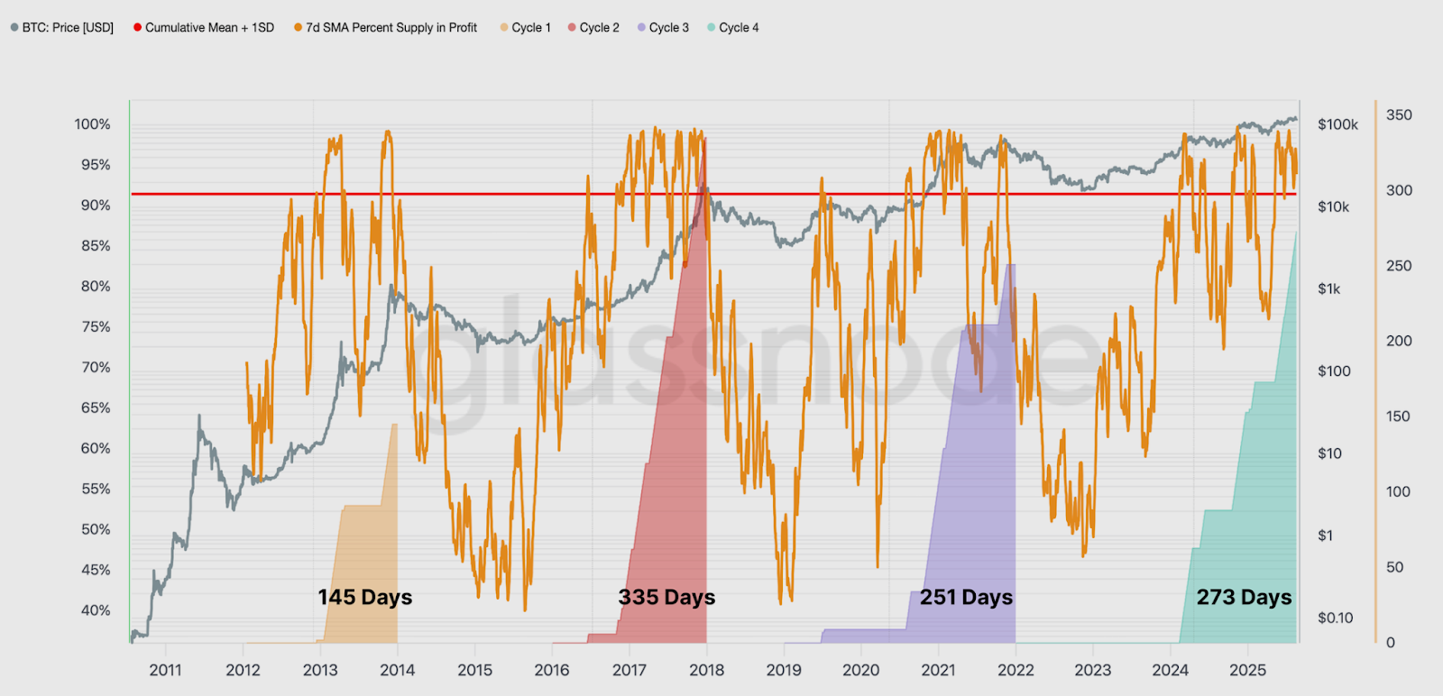 Bitcoin supply in profit has been elevated for 273 days, signaling a potential cycle peak soon.