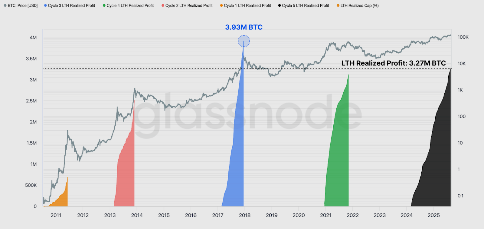 Analyzing the cumulative profit realized (in BTC terms) by long-term holders (LTHs) — investors who have held Bitcoin for at least 155 days — from the point of reaching a new cycle all-time high, until the final peak of the cycle, revealed that LTHs have realized more profit than in prior cycles.