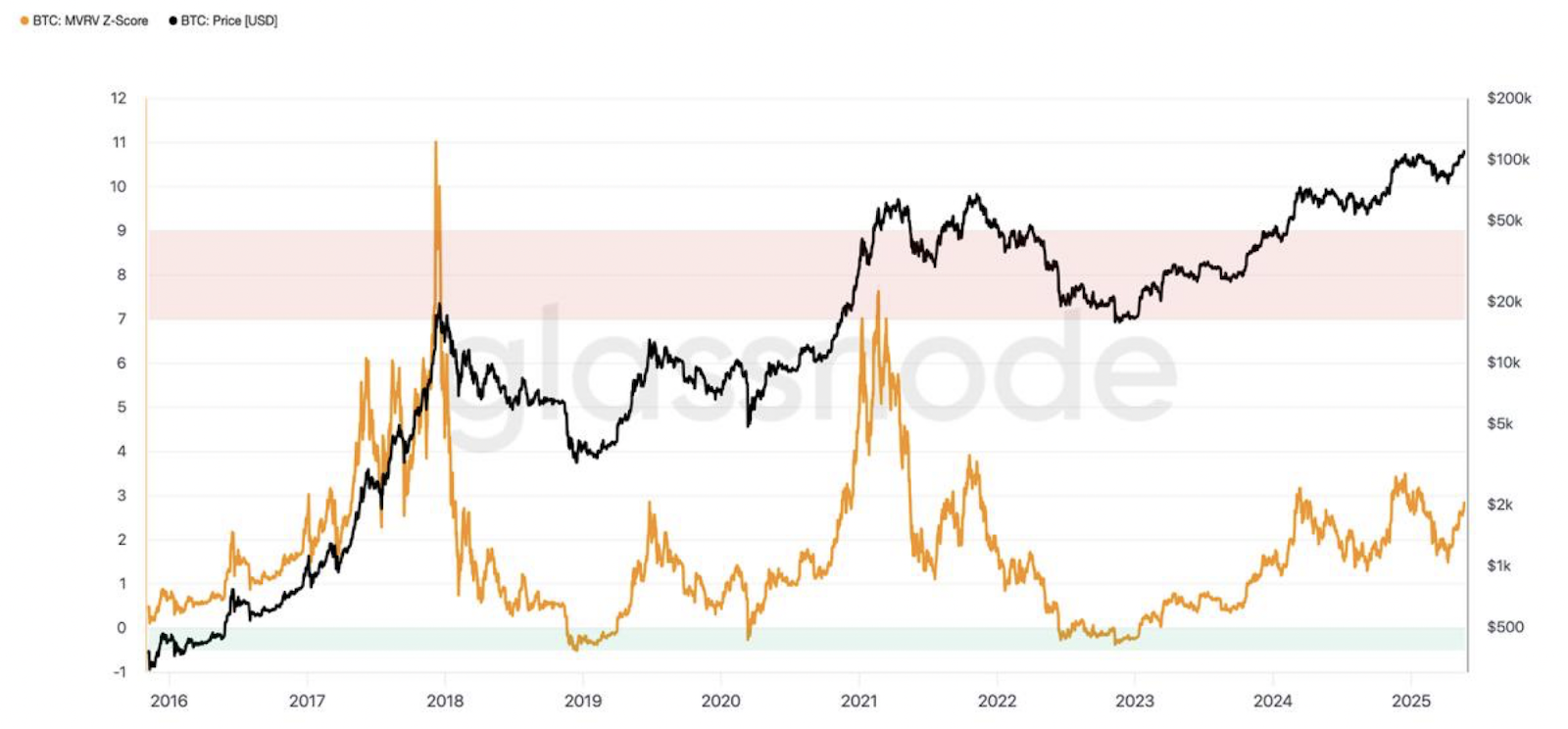At 2.8, the MVRV Z-score is still significantly below the red zone, suggesting that the market top is not yet in.