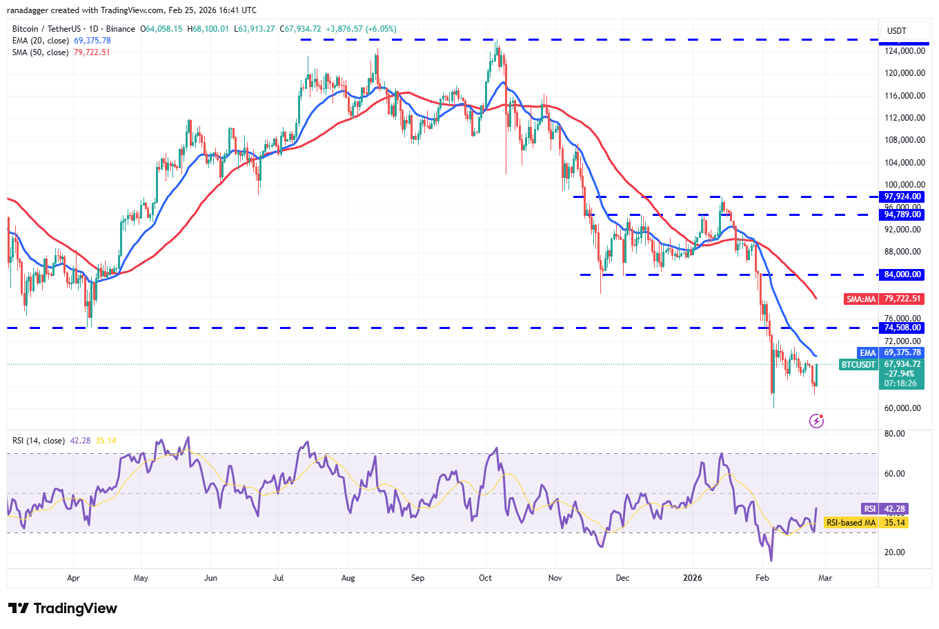 The SOL/USDT pair is attempting a recovery, which is expected to face selling at the 20-day EMA ($87). If the price turns down sharply from the 20-day EMA, the possibility of a break below the $76 level increases. The Solana price may then tumble to the Feb. 6 low of $67.