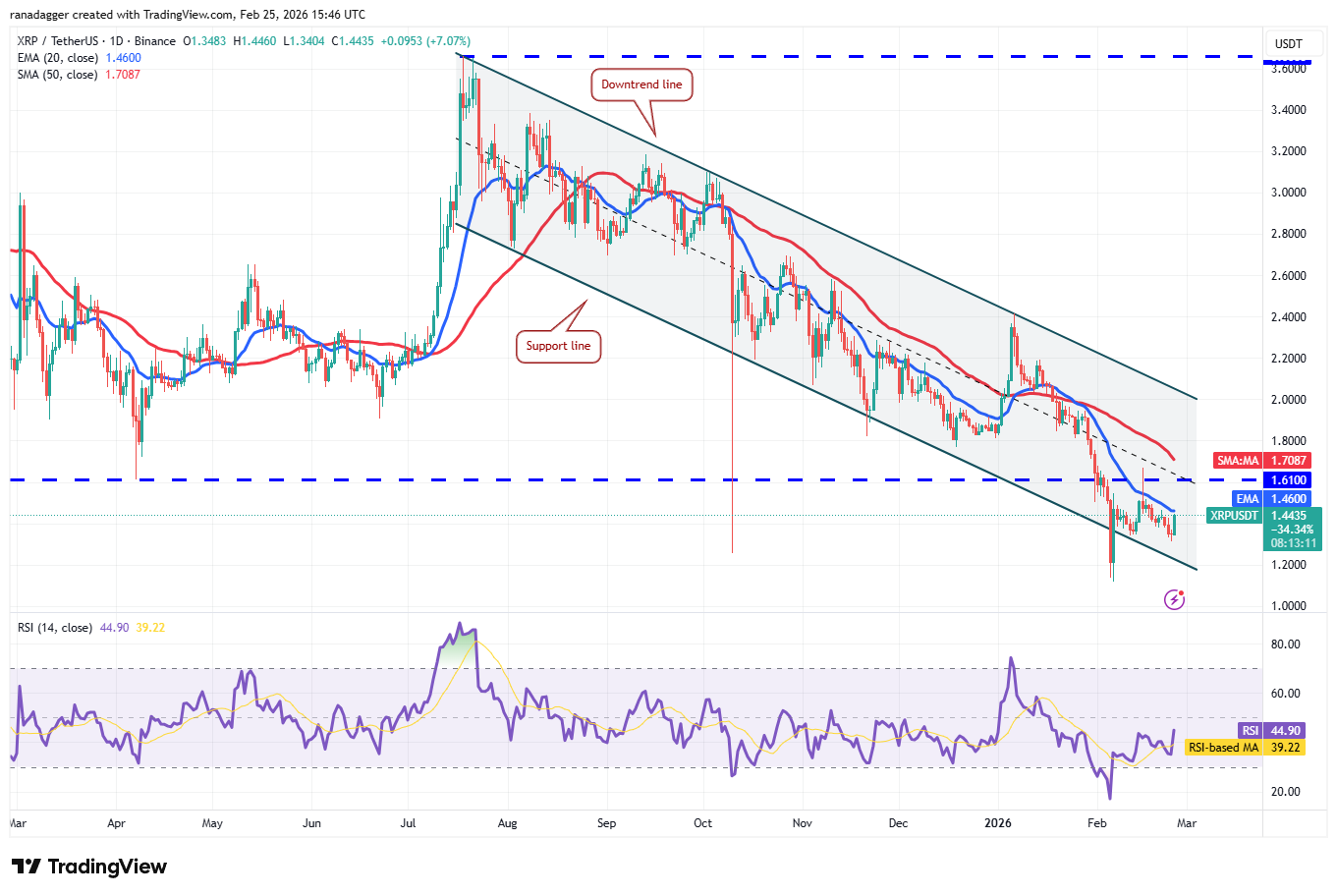 If the XRP price closes above the 20-day EMA, the XRP/USDT pair may rally to the 50-day SMA ($1.70) and eventually to the downtrend line. Buyers will have to clear the hurdle at the downtrend line to signal a potential trend change.