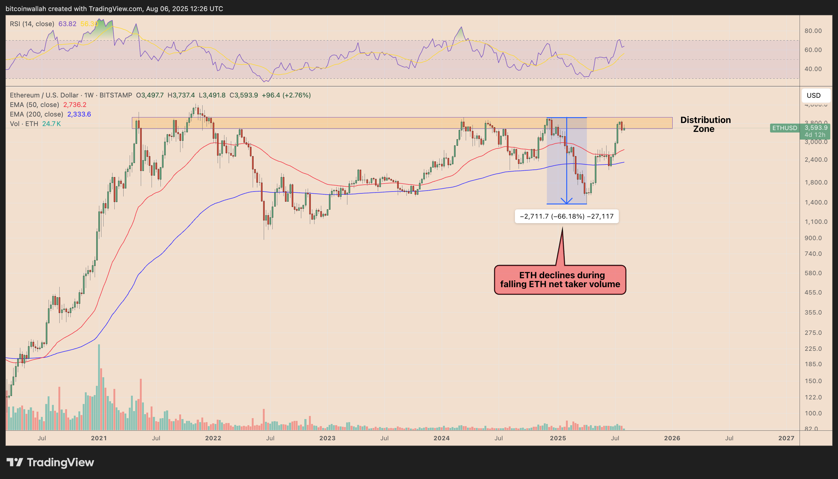 The confluence of bearish signals increases the probability of ETH retreating toward its 50-week and 200-week EMAs — currently at $2,736 and $2,333, respectively — by September or October, similar to the decline seen in late 2024.