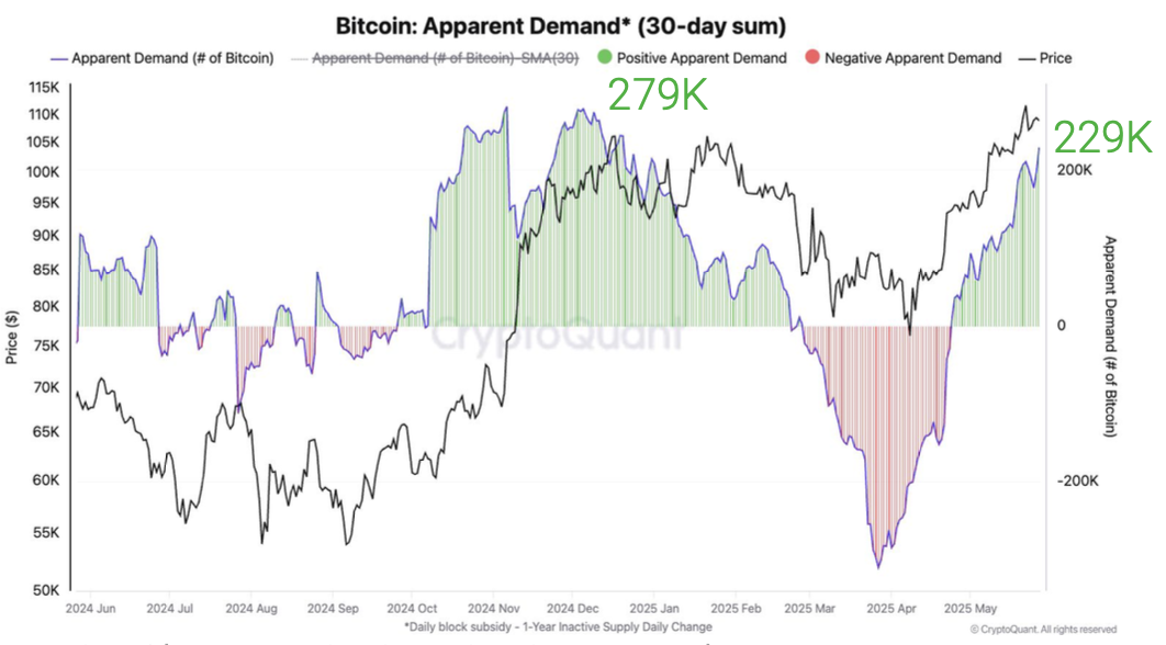 “CryptoQuant’s estimate of Bitcoin’s demand growth in the last 30 days is at 229K, which is near the previous demand growth top of 279K Bitcoin reached in December 2024,” its authors wrote.