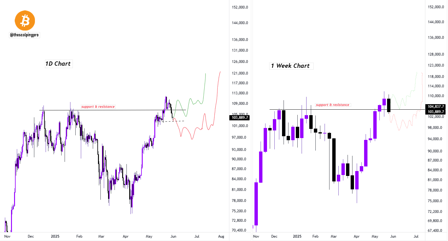 Mags focused on the upcoming weekly candle close as a key test of bulls’ strength, with the price still able to retake the old record close at $104,450 from December 2024 on weekly timeframes.