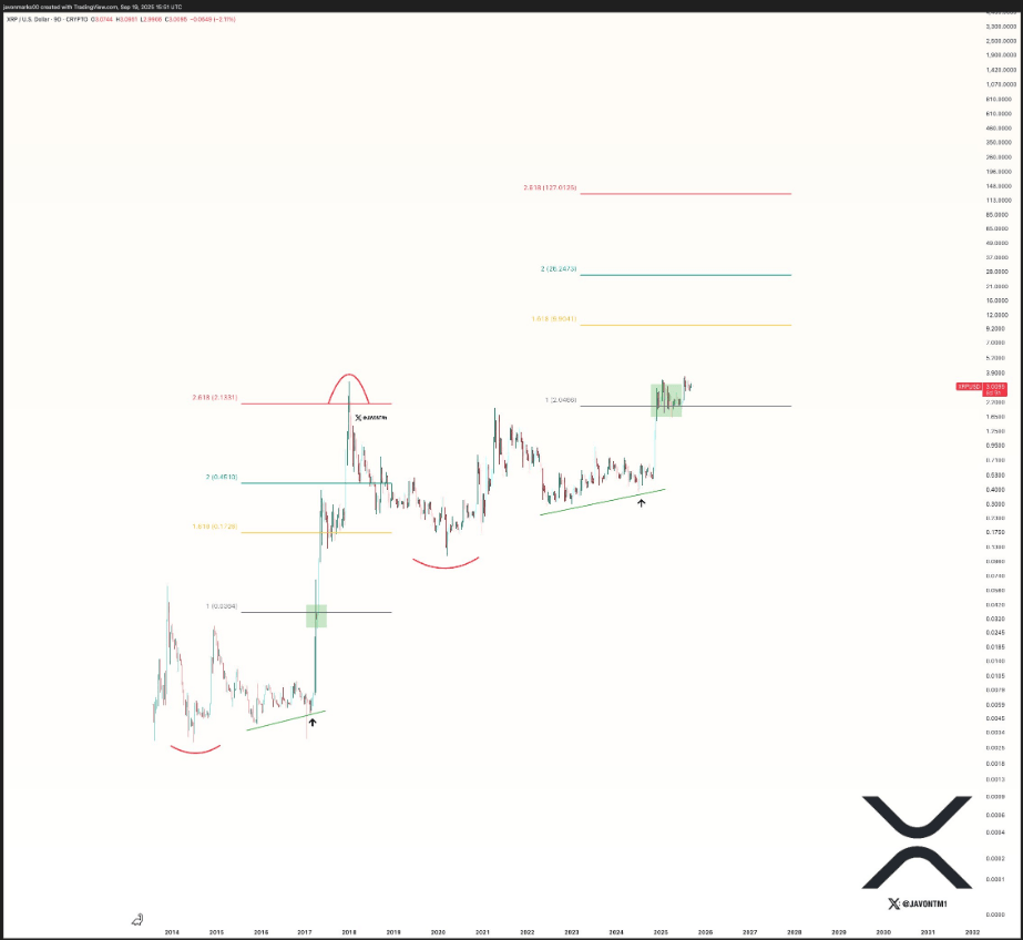 Trader Javon Marks posted a chart showing what he called a large accumulation pattern. Based on his view, XRP could climb by 226% to reach $9.90, and if that zone is cleared the path to $20 could open.