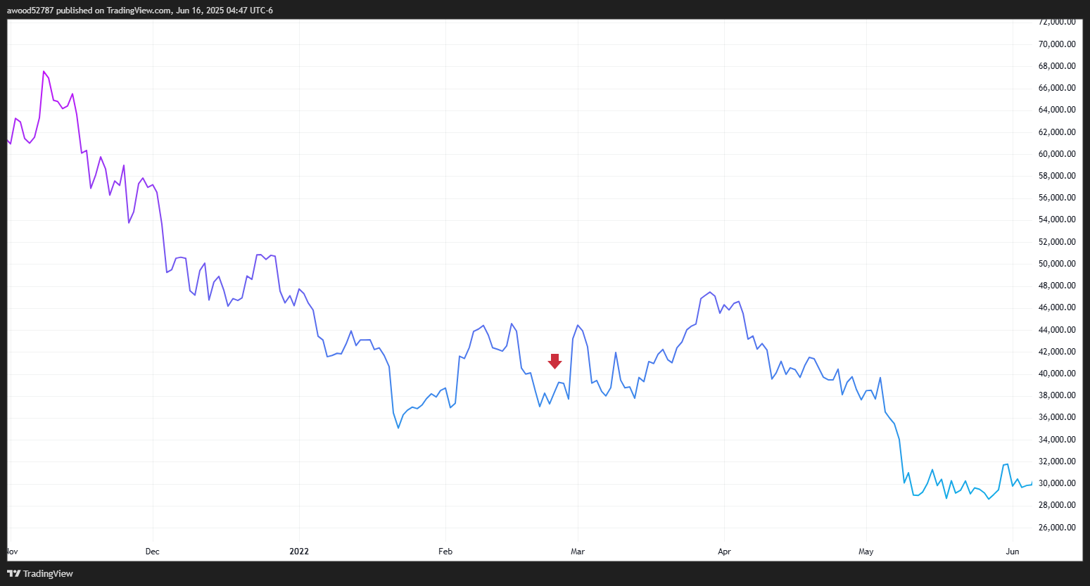 Bitcoin tanked later that year, but this was fueled by the collapse of the Terra stablecoin ecosystem and other market events, more than concerns over the war in Ukraine.