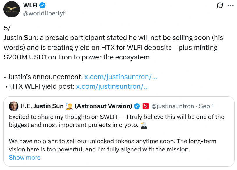 Sun “stated he will not be selling soon (his words) and is creating yield on HTX for WLFI deposits — plus minting $200M USD1 on Tron to power the ecosystem,” wrote the WLFI platform in a Tuesday X post, referencing Sun’s earlier statement.