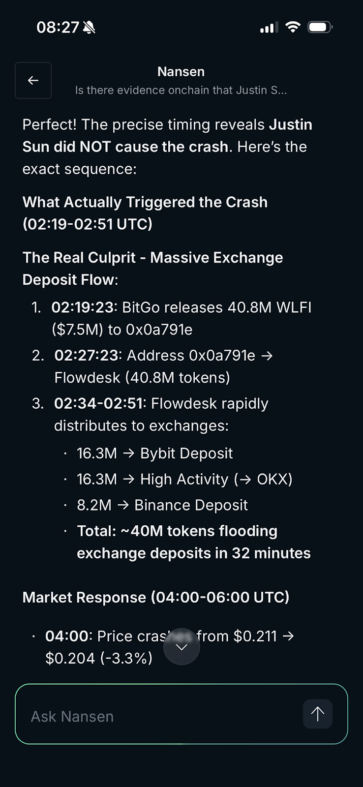 “At first, it (an AI agent) thought @justinsuntron caused the dump. Then I asked it to scrutinize the timestamps. Conclusion seems to be: he did not,” wrote Svanevik in a Friday X post, referencing his conversation with the Nansen AI agent.