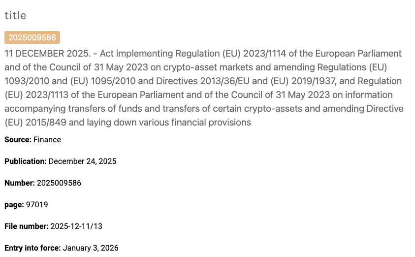 While the MiCA framework entered into full force in late 2025, Belgium had not adopted national laws implementing MiCA until recently. The member state published its implementing law in December 2025, with MiCA becoming legally effective in Belgium on Jan. 3, 2026, according to the Belgian Official Gazette.