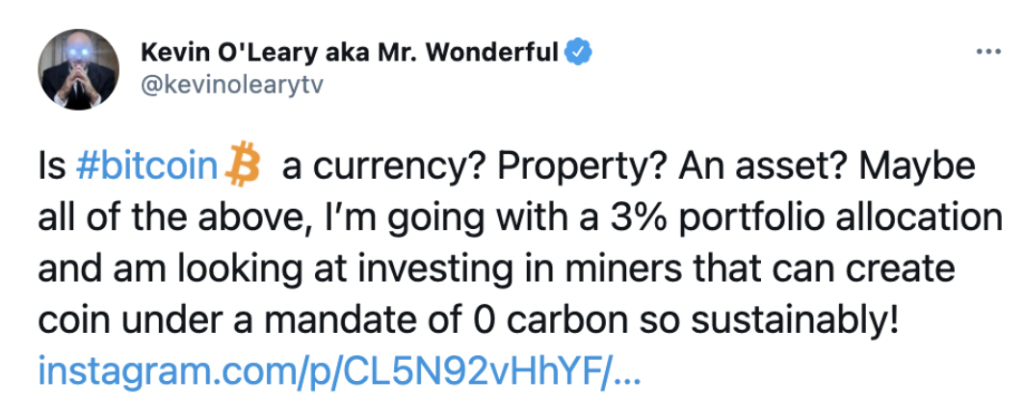 But two months later, in March 2021, O’Leary did a complete 180-degree turn, announcing in a post on X (then Twitter) that he planned to allocate 3% of his portfolio to Bitcoin while exploring investments in environmentally sustainable cryptocurrency mining.