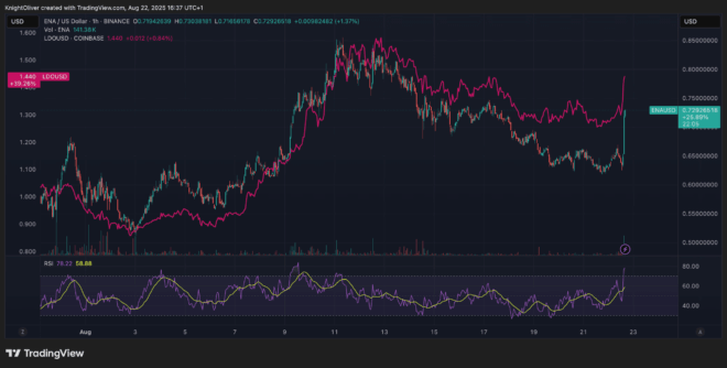 Trading volume for ENA trading pairs doubled in the past 24 hours to $1 billion, while LDO is up by 83% to $256 million, according to CoinMarketCap.