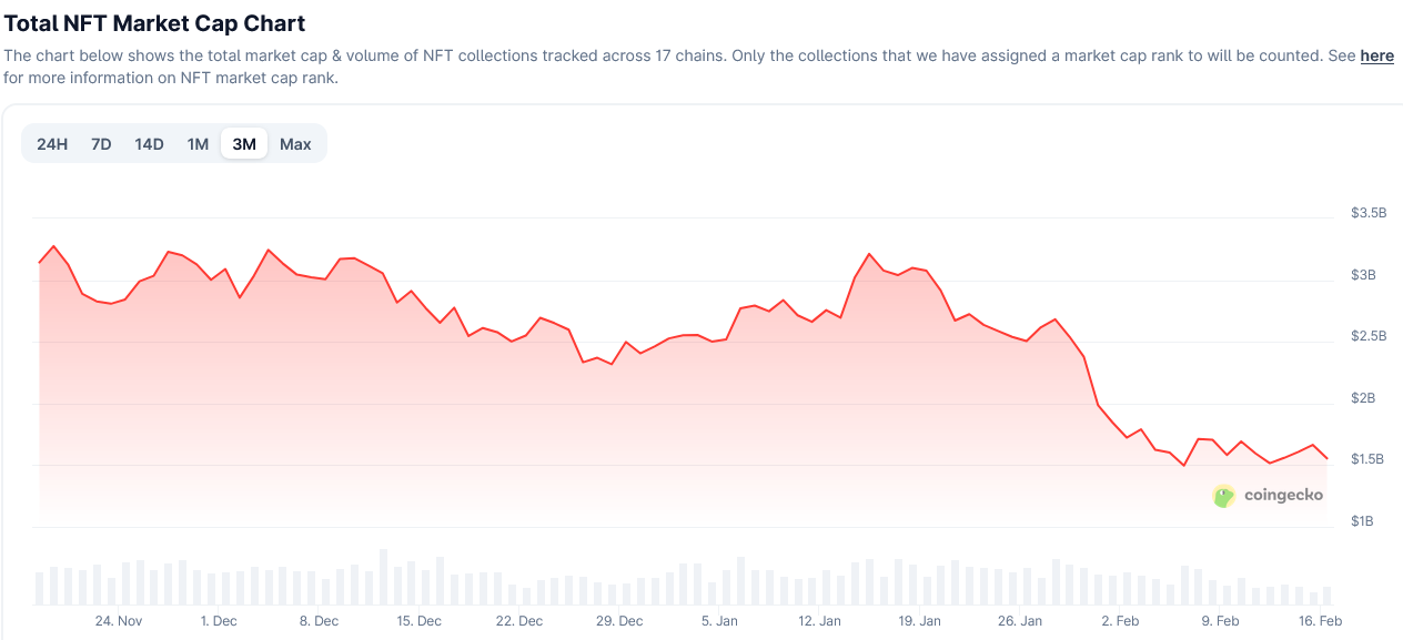 While the NFT market started strong in the first two weeks of 2026, the total NFT market cap has since fallen by more than 50%, from $3.2 billion to $1.55 billion amid a broader market pullback.